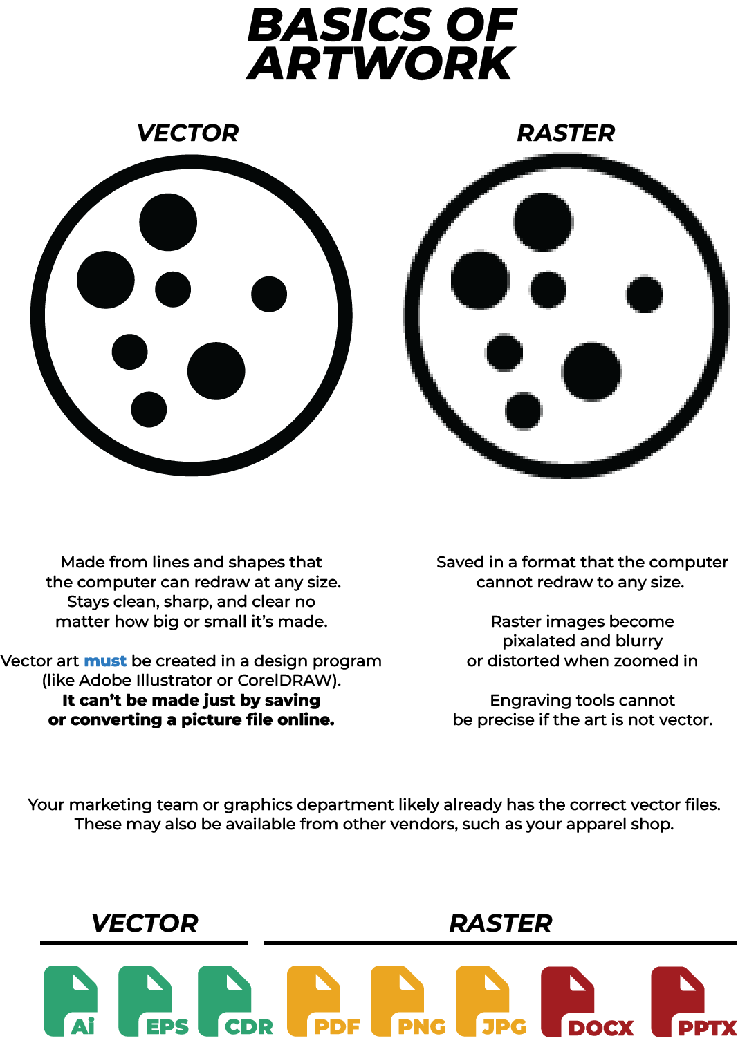 For ENGRAVING or SANDBLASTING: Vector Black & White Line Art (no grayscale, color, or halftones) in PC-platform file formats is STRONGLY RECOMMENDED as it will give you the best result: CDR, EPS, AI or PDF.